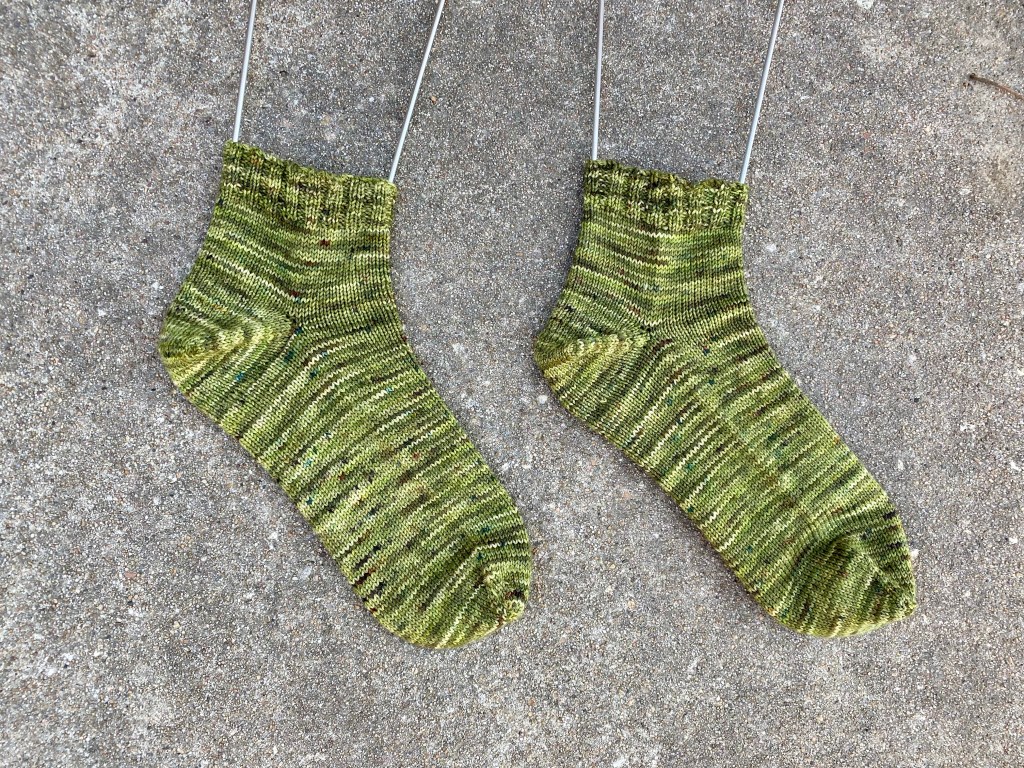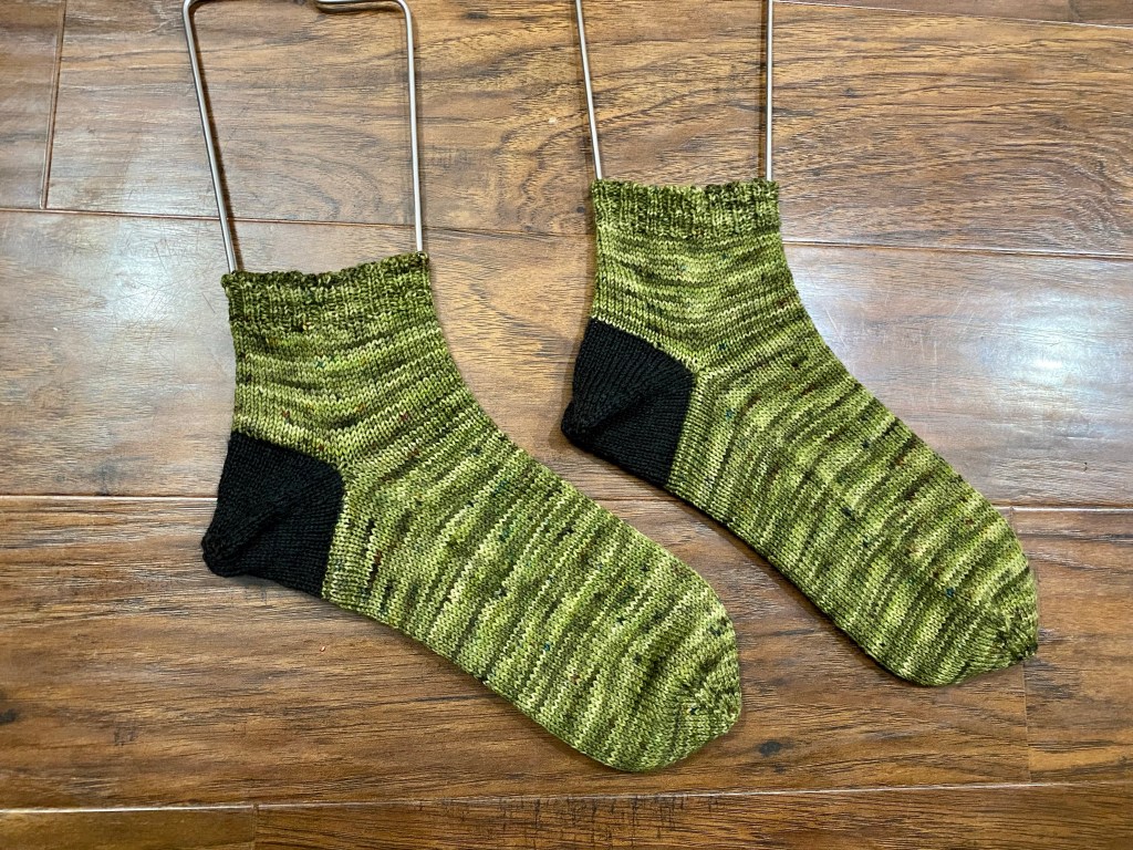 After finishing my shorties last week, I found myself with no socks on the needles and a date night planned with my hubby. I conned him into taking me to The Lost City with Sandra Bulluck and Channing Tatum. So I hurriedly grabbed the first sock yarn I found and got a sock toe cast on.
