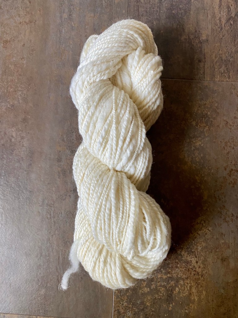 My white merino yarn came out of its bath beautifully. I was actually surprised to see a pronounced sparkle! I did not notice ANY sparkle as I was spinning and plying. I am wondering if it was dulled by spinning oil? Nevertheless, it was a welcome surprise!