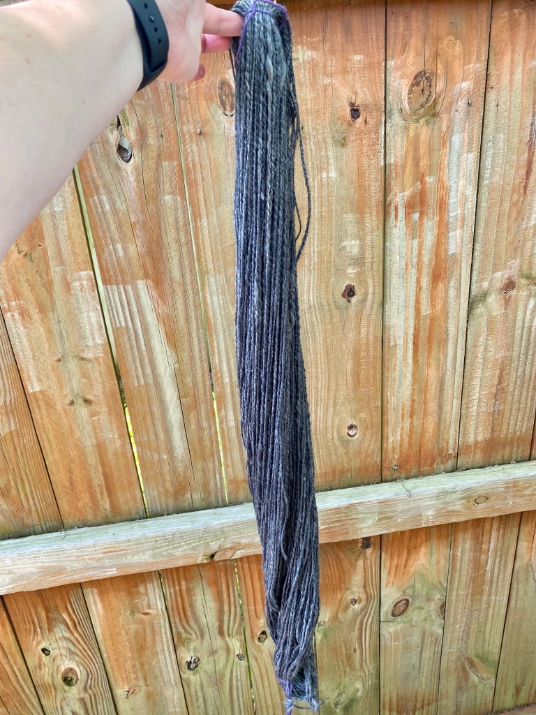And I was right, a bath and a whack had this skein nicely balanced. Since it is 90+ degrees in Kansas now I set this skein outside in the sun to dry. And boy howdy, it dried in four hours! I need to take the time to weigh and measure this skein to find out what kind of yarn I made.