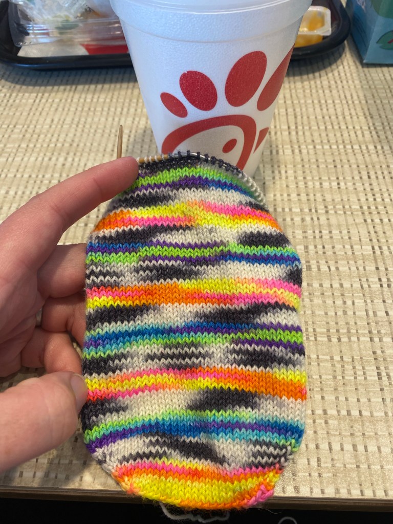 I think I am about five inches into the foot. These colors are crazy and I think I am going to install an afterthought heel instead of a gusset heel. I’m considering using the self-striping but also maybe a solid black or pink heel to offset off the wildness?