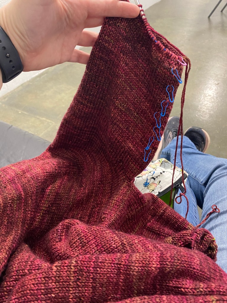 I am cruising along on my first sleeve of my Super Simple Summer Sweater (Joji pattern). I managed to add in four more decreases during PB’s weekly gymnastics practice.