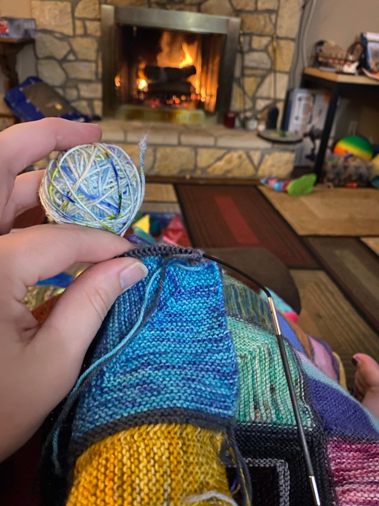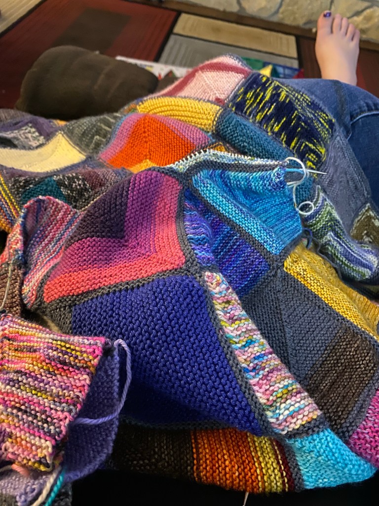 I sent a photo of this project to my friend who recently started knitting. I had shared some of my hand knit socks with here and she spotted the squares that match her socks! I’m doing my best to convert her to a knitter with a capita K! So far its going swimmingly…..