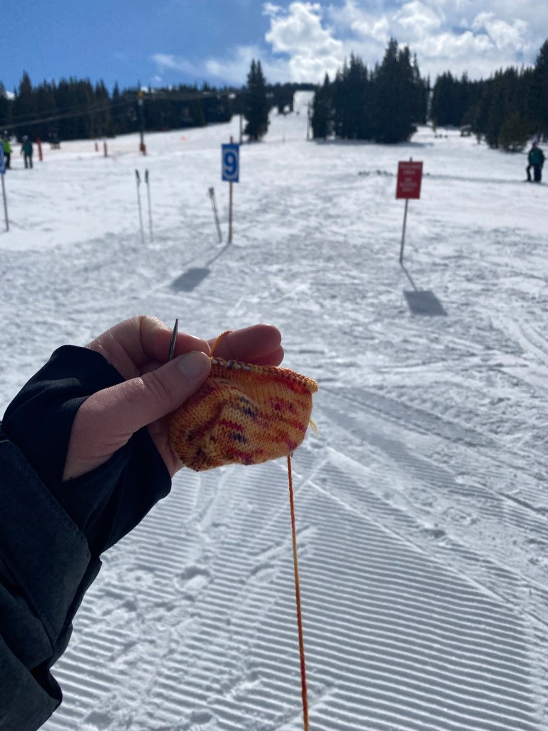 We took the kiddos for a little fun and the first time skiing. I had to tuck some knitting into my ski bag. So my ankle socks got a little mountain time! This is the toe of the second sock as I finished the first one last week. The weather was warm enough to knit without gloves for the most part. But alas, keeping track of two kids on the family slope didn’t give me much free time.