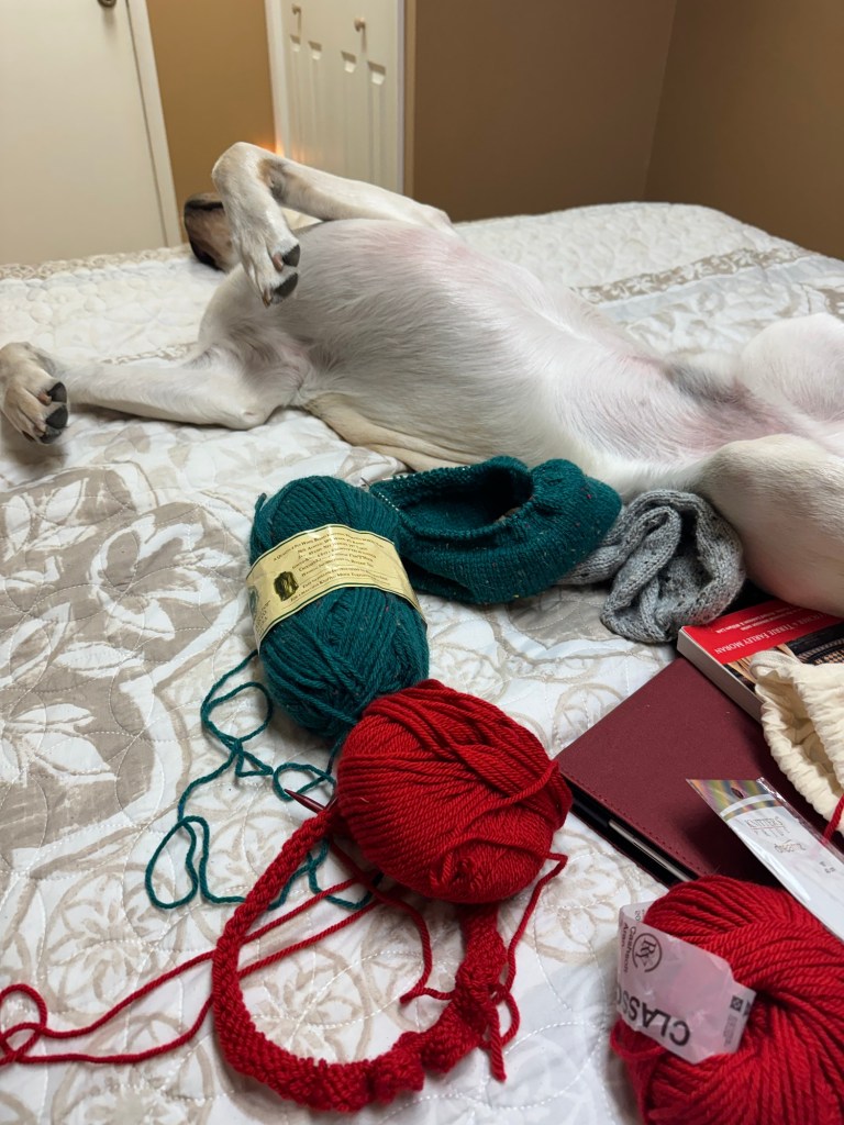 I had my computer, my book and like three knitting related projects for one 3-hour Netflix binge session. I have my Wool Tweed Hat, Classy Cashmere Hat and my Sea Slug Hat all rolling around here. And Duke…..completely passed out and snoring. He adores sleeping upside down.