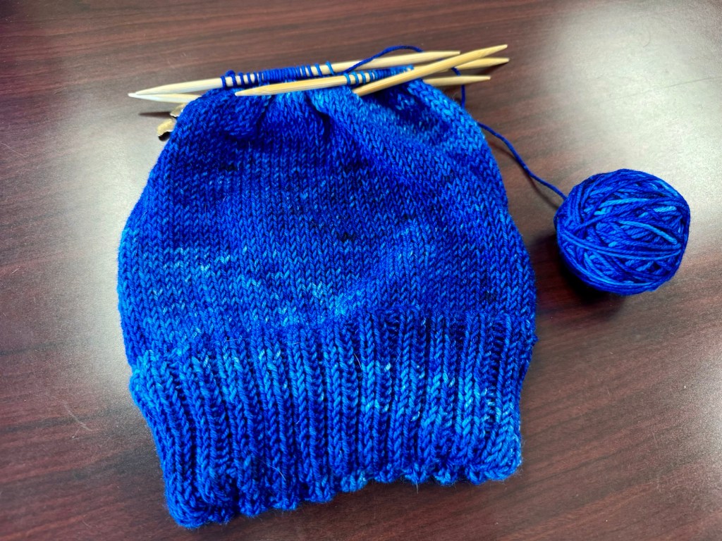 Another Royal Hat is ready for decreases. And I noticed something about this hand dyed skein. At my gauge it is spiral pooling around the circumference of the hat.