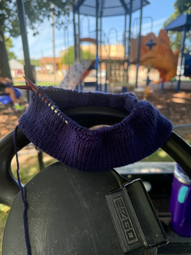 In between “mom watch this” and “mom, come start my swing” I managed to get the brim finished, folded and attached. It was a little trickier picking up this dark yarn. I was happy for the daylight!
