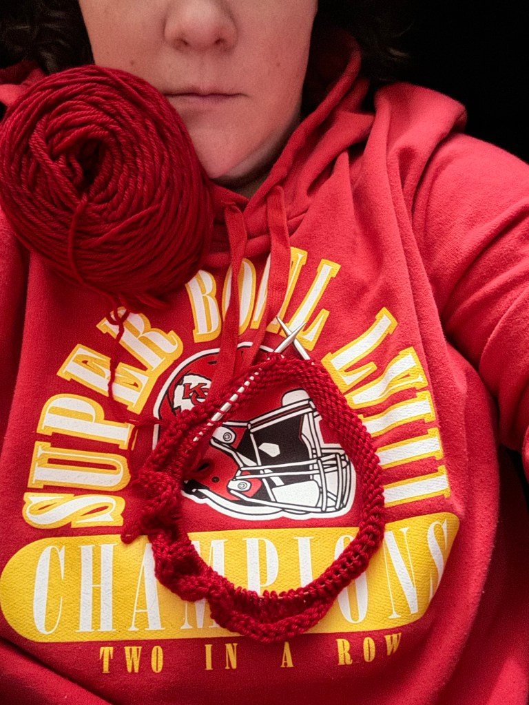 I do live in Chiefs country, but I have only a mild allegiance. My dad got me this sweatshirt and it’s super cozy. And I am playing in the Down Cellar Studio Pigskin Party KAL so I decided to make a Chiefs hat for my dad. It will be a nice gift for him and I will get bonus points in the KAL!