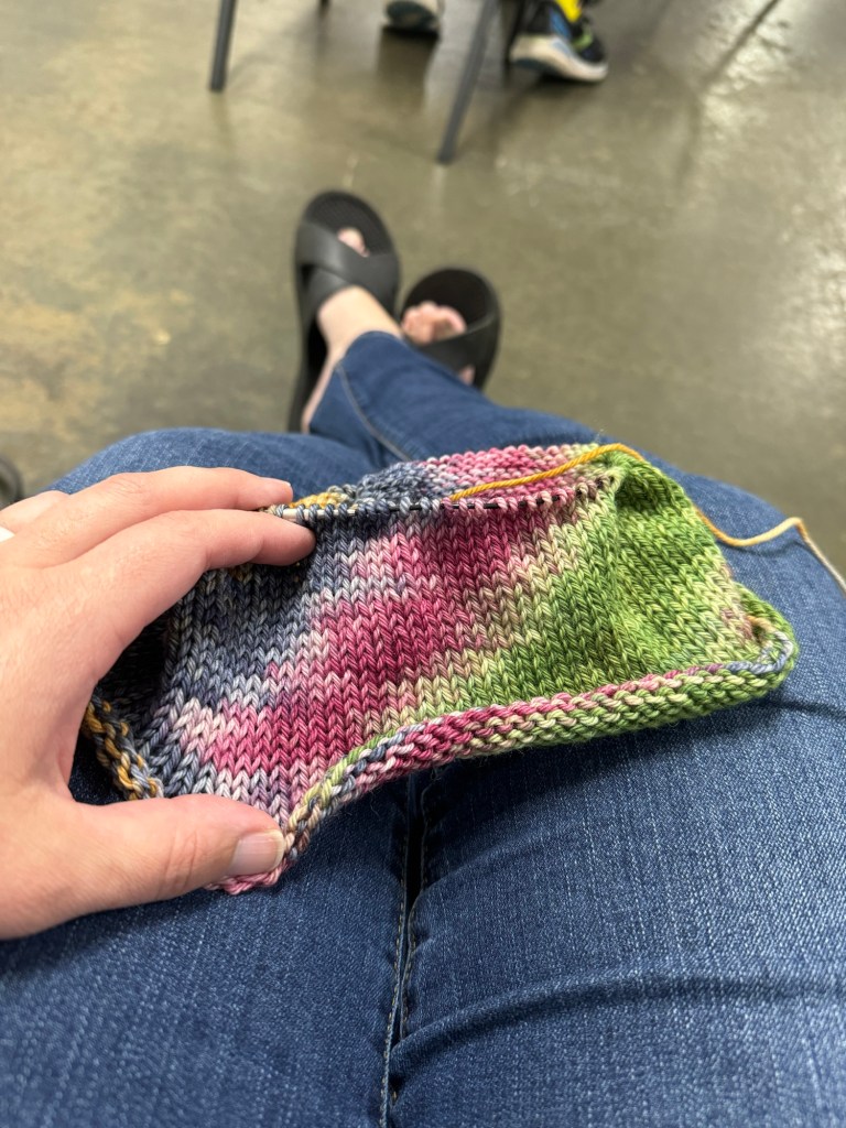 This skein has a very rainbow like palette and looked to be variegated in the skein. But I was pleased to find that at my 88 stitch count and my gauge, it spirals! Each rainbow is wrapping around the hat so far.