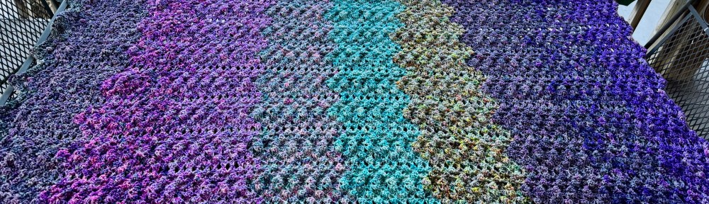 I coming to the realization that this thing will be mahoosive. Unblocked and still one skein to go….this thing covers my parents patio table. This will probably end up a large throw size. I am fairly happy with the color progressions. If I wasn’t trying to clear out this yarn, I might have left out the teal and the green/yellow.