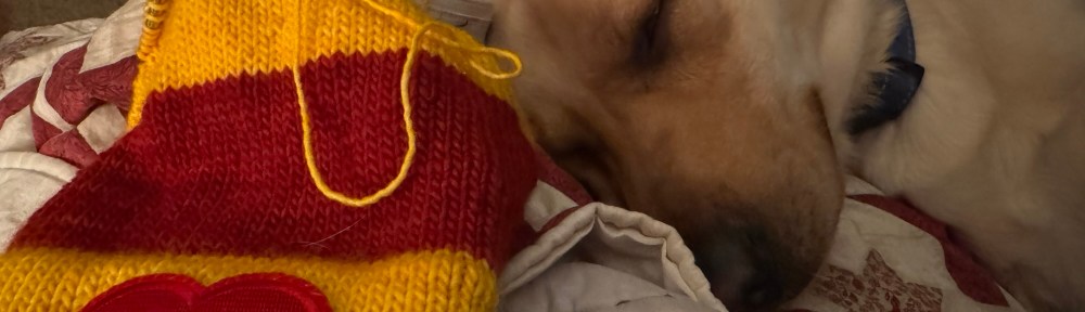 So I decided to just share a cute photo of my baby dog loving on me while I was knitting my Chiefs Hat #7. He was dreaming and snoring and living his best life. Not a bad leg warmer for me either! I would be lost without my puppers….