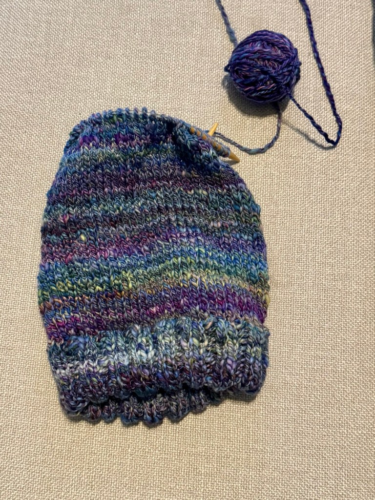 It’s true when they say that you should knit with your handspun so you can see what how it works up in fabric. Is it my most even yarn? Absolutely not but will make a cozy hat! I am knitting on US 10.5s and I don’t have that sized DPNs. I am just going to make due with the US 8s again and try to manually manage my gauge to finish.