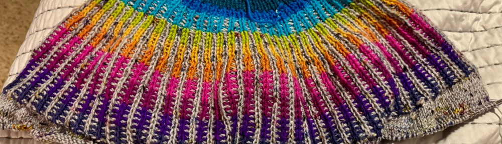 After some fiddling and a few dropped stitches, I have my Rainbow Radiate ready for sleeves!