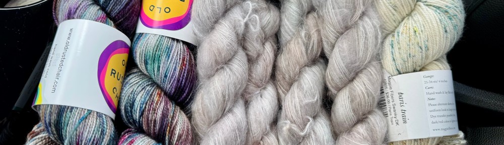 For the Love Note I grabbed two skeins of Old Rusted Chair sock yarn in a variegated purple, some Malabrigo Mohair in a neutral silver-ish color and one skein of Magpie Fibers Swanky DK because I couldn’t resist cashmere.