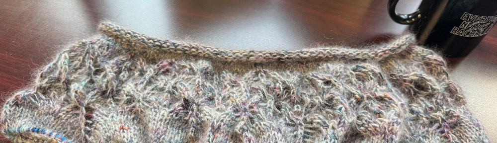 I knit down from the lace and got the sleeves divided. This thing is shedding ALL OVER the place. I think I am going to knit down just a wee bit and then start the sleeves. I will use the other skein of sock yarn to make the sleeves consistent. I haven’t decided if I will do the short or long body.