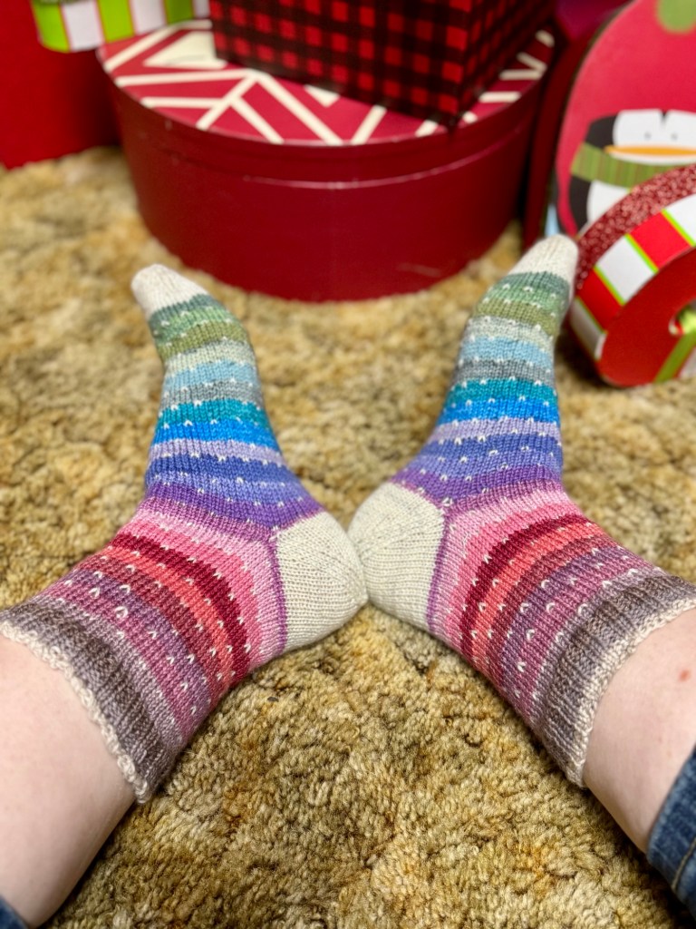 This year the Cozy Knitter went back to a rainbow theme and I’m not mad at it. I used exactly half of the self striping yarn and almost all of the contrast mini. So I can make a second pair of socks and I’ll just need to find another mini for the heels. And skip the flecking this time.
