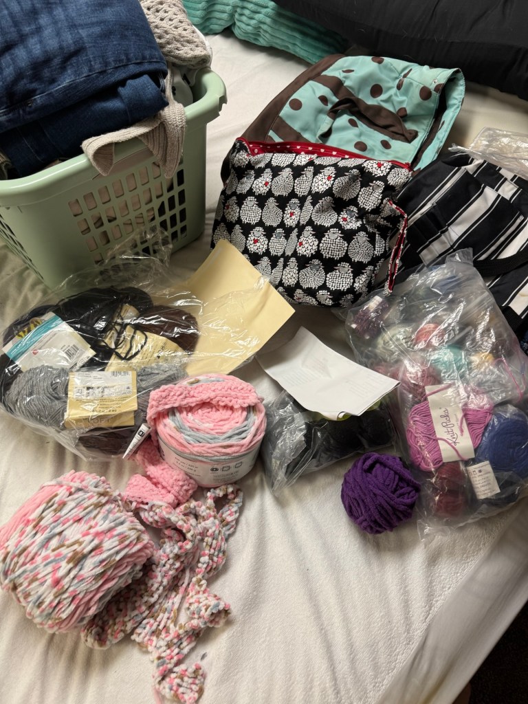 And I did in fact find the tub of knitting items that I knew I was missing. Some of this yarn I had forgotten about. It was a lot of Caron Simply Soft and some chenille for blankets. And weirdly a ton of knit picks back from my craft fair days.
