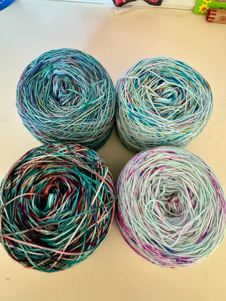 I hand wound each skein into a ball during a long work meeting on my WFH day. And then I sat down with a Sallie Goldenbaum audio book/knitting mystery and use my yarn winder to make cakes. This pattern uses two ends of the yarn so they have to be cakes OR wound into separate balls. I chose the former because I’m altering the patterns and I don’t know how much of each color I will need.