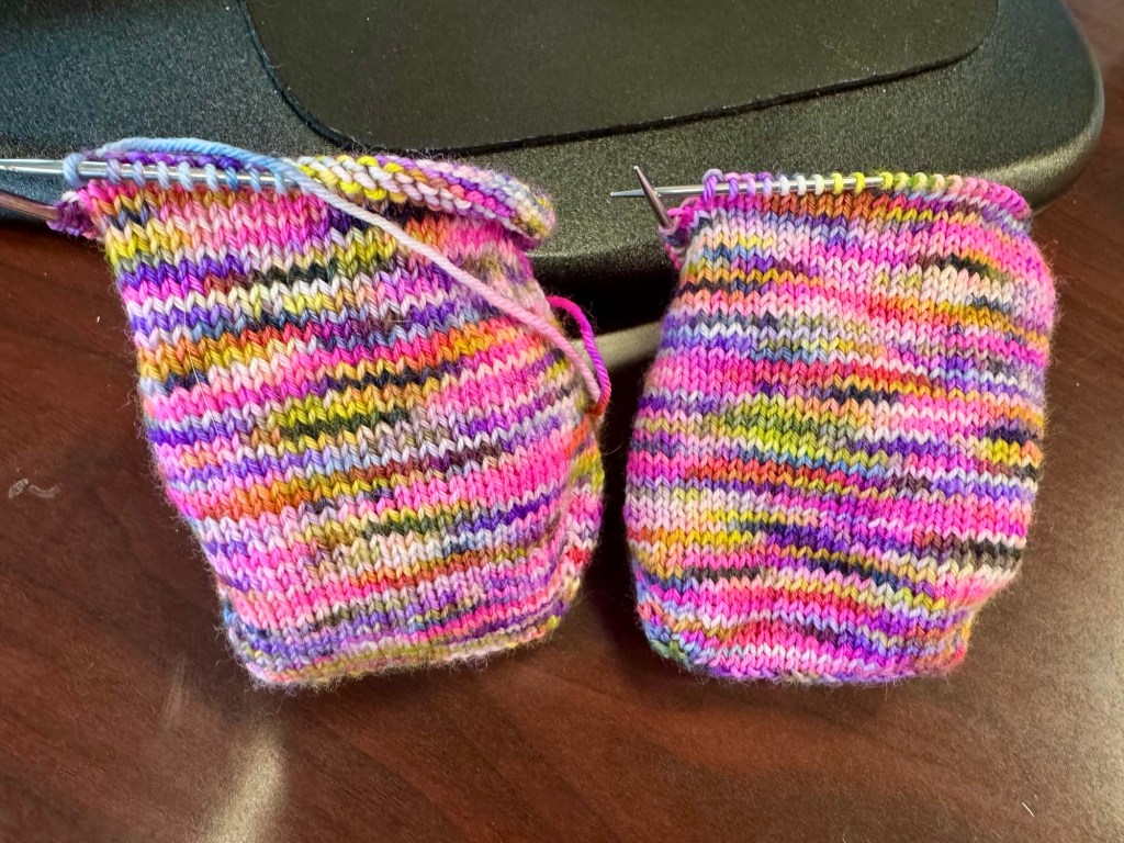 I have spit spliced in the green yarn and will continue to finish the foot portion. I haven’t measured the sock yet but I do plan to do a toe up gusset heal. So I need like 7 or 7.5 inches of foot before I can start.