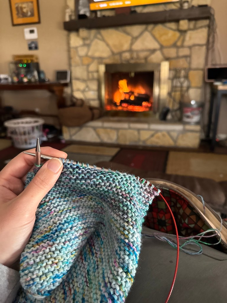 Okay, I have returned to knitting in front of the fire and not in the hammock. Mother Nature was not done with winter temps here. And being cozy motivated me to push through color #2 and get into color #3 for my In The Light Blues.