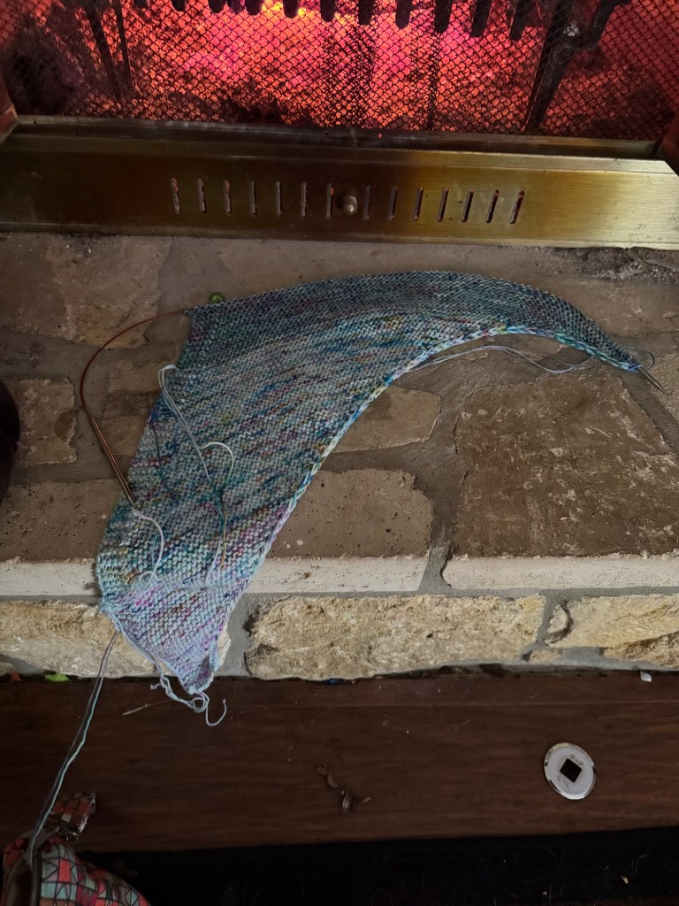 Honestly, I am loving these colors and yarns so much I am already contemplating making a second shawl with these first three colors. Only this time flipping and starting with the dark AND following the pattern’s three color transition. I just have to finish this third color and find a second set of needles….because why not one more WIP?