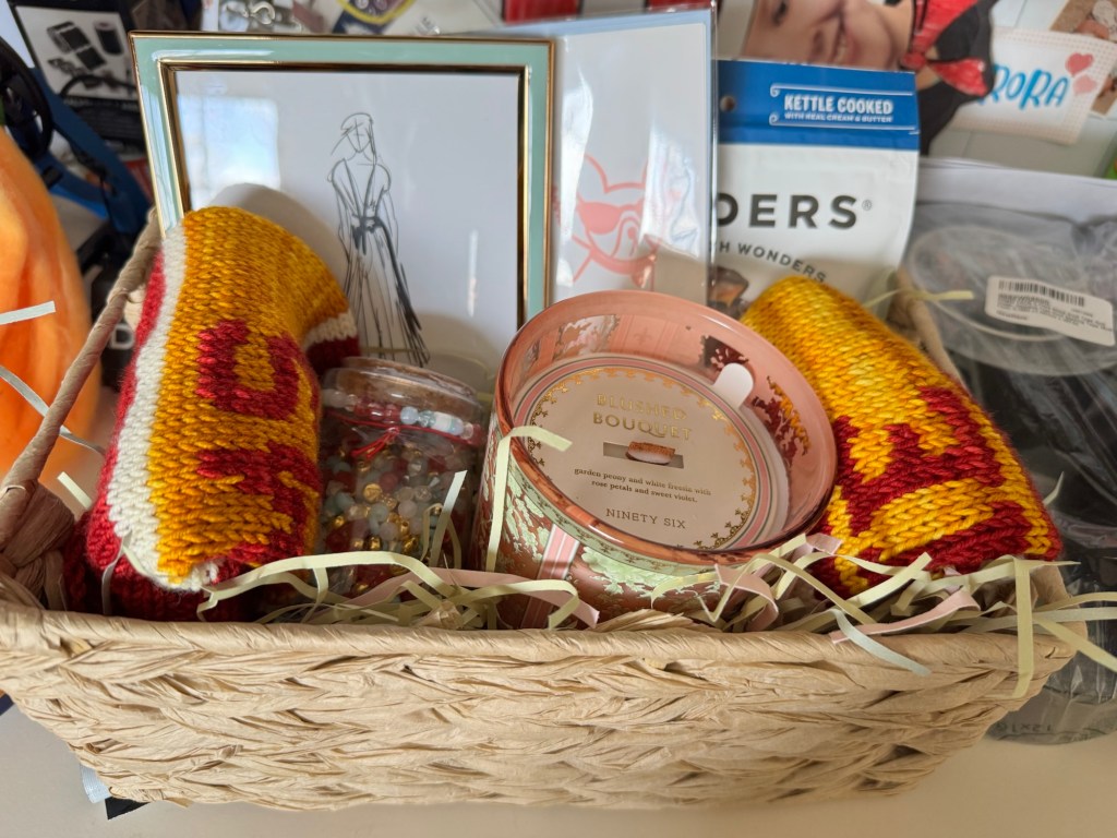 The party theme is Taylor Swift’s Opalite. So I went to Home Goods and found some coordinating paper, basket, candle, beads (she makes bracelets), frame, chocolate and I added the two Swiftie Hats I made.