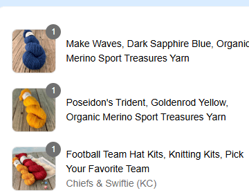 So I went to a local to me dyer and grabbed some of her yarn to work these again. As these teams are also local to her she has colorways that match really well. I got the actual Chiefs kit she makes in Worsted weight and then a blue and a gold skein in sport to make the Royals Hat.