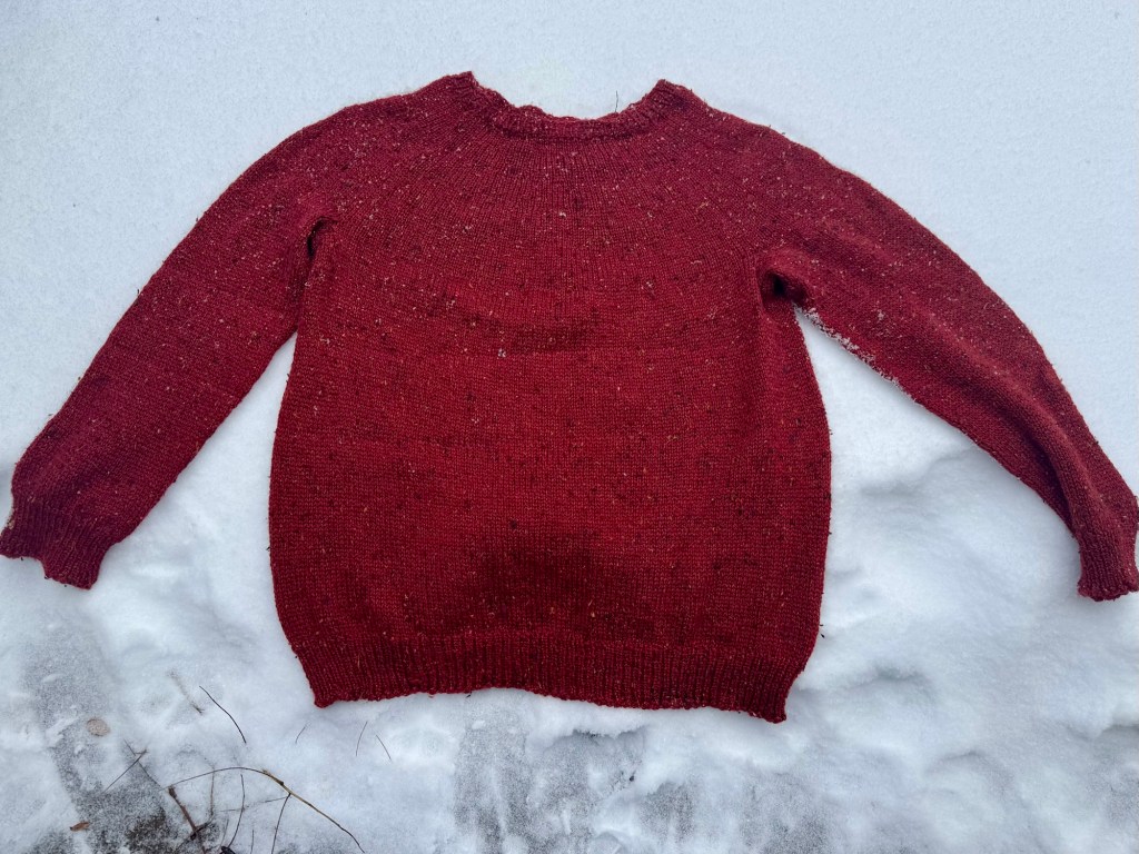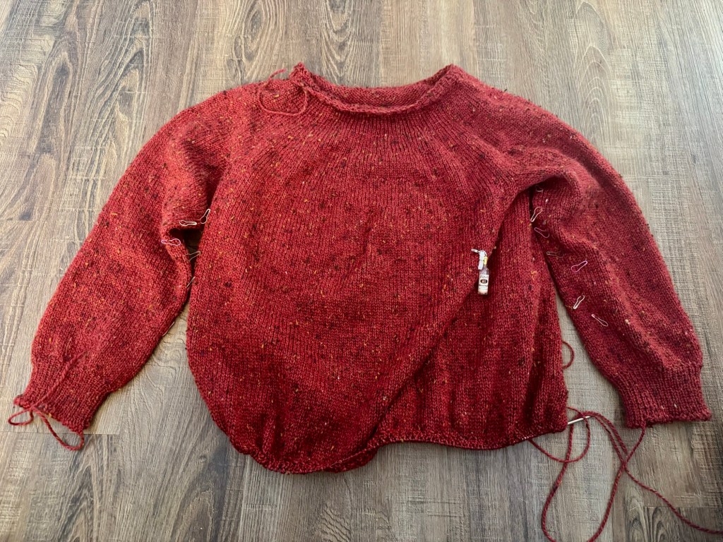 The body is great, the sleeves are great and the neckline is loosy goosey. I need this to finish drying and then I think I will grab a crochet hook to add a line of reinforcement inside the neck ribbing. Maybe two?