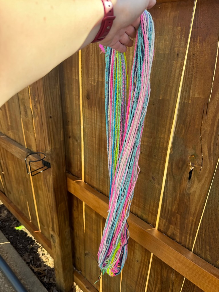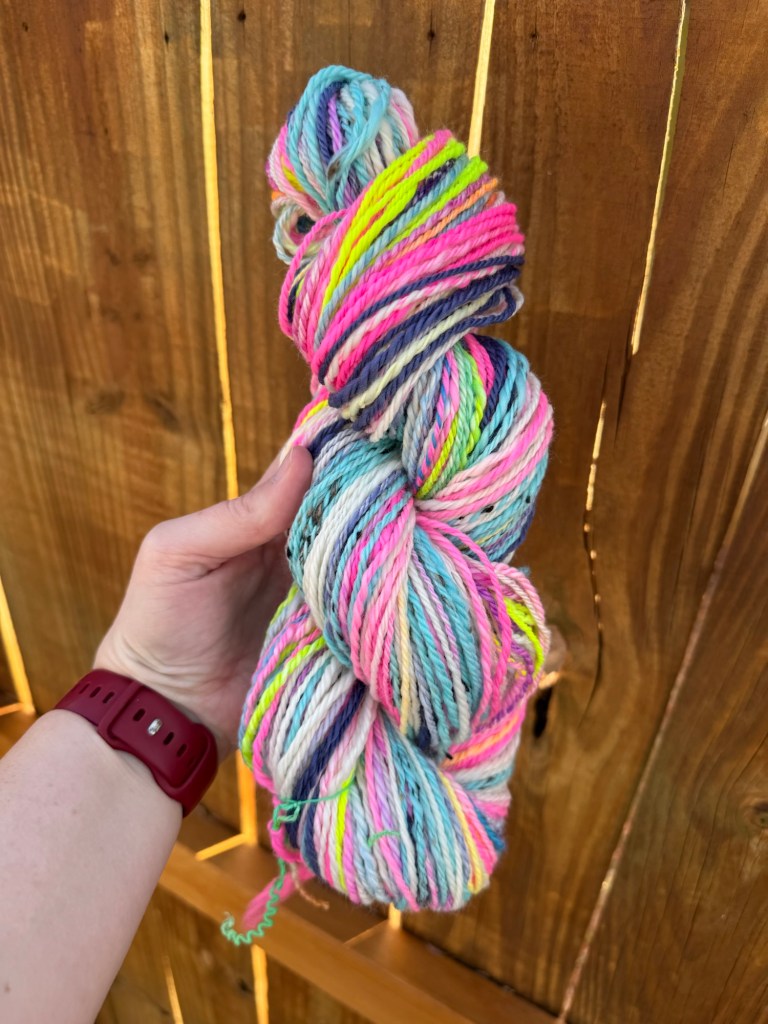 I chain plied these singles to maintain the colors. I think overall I got a heavy worsted that is mostly uniform with some thick/thin spots. I was worried about the colors being too crazy but I think they came our mostly rainbow, in a good way.