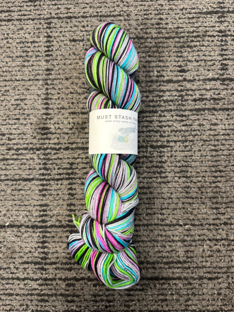 PB, like most girls her age, is obsessed with K-Pop Demon Hunters. And Stacey of Must Stash Yarn released a self striping colorway on brand. I had to buy it.
