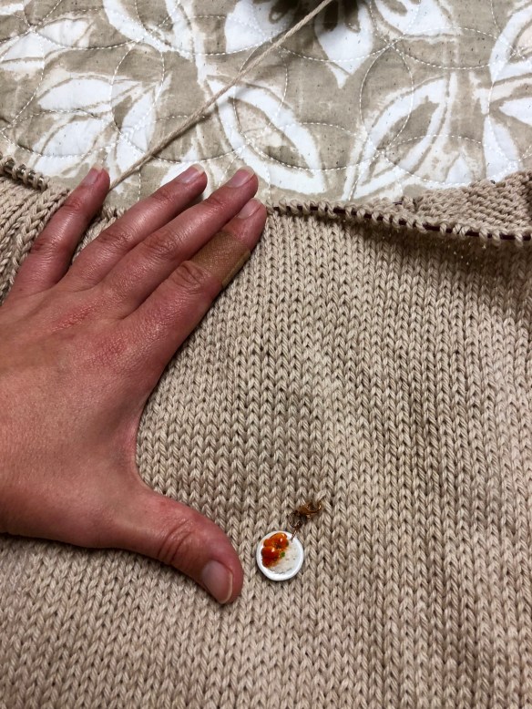 The body is still on a cord with some cord stoppers I dug out of my interchangeable set. I think this is the first time I have every used them for this purpose. However, they are coming in really really handy now. It’s nice to feel like my live body stitches are secure and just hanging out waiting for me to come back.
