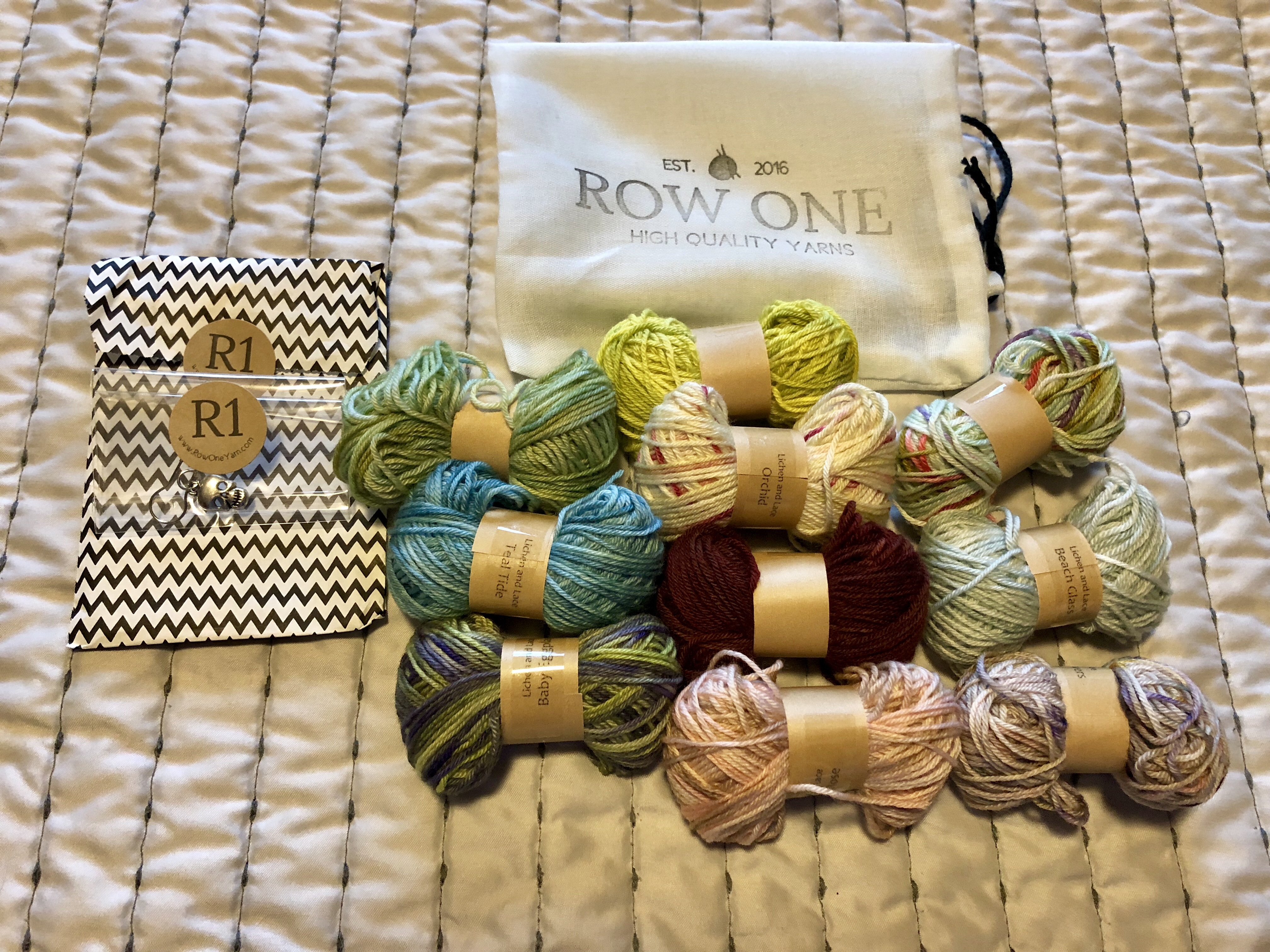 I saw Row One yarn minis on the Grocery Girls podcast. And I thought to myself, if can make some monthly goals and health habits then I am going to sign up for a month. And I hit my targets and got a lovely package that contained Squishy sock yarn from McMullin Fiber Co.
