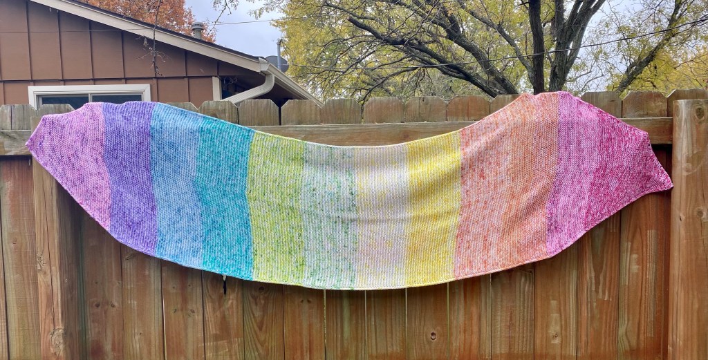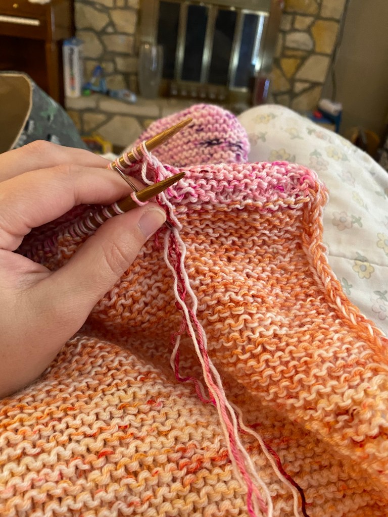 There are three mini skeins left and then the contrast border. I want to make the finished end look like the beginning. Thank you mild OCD.