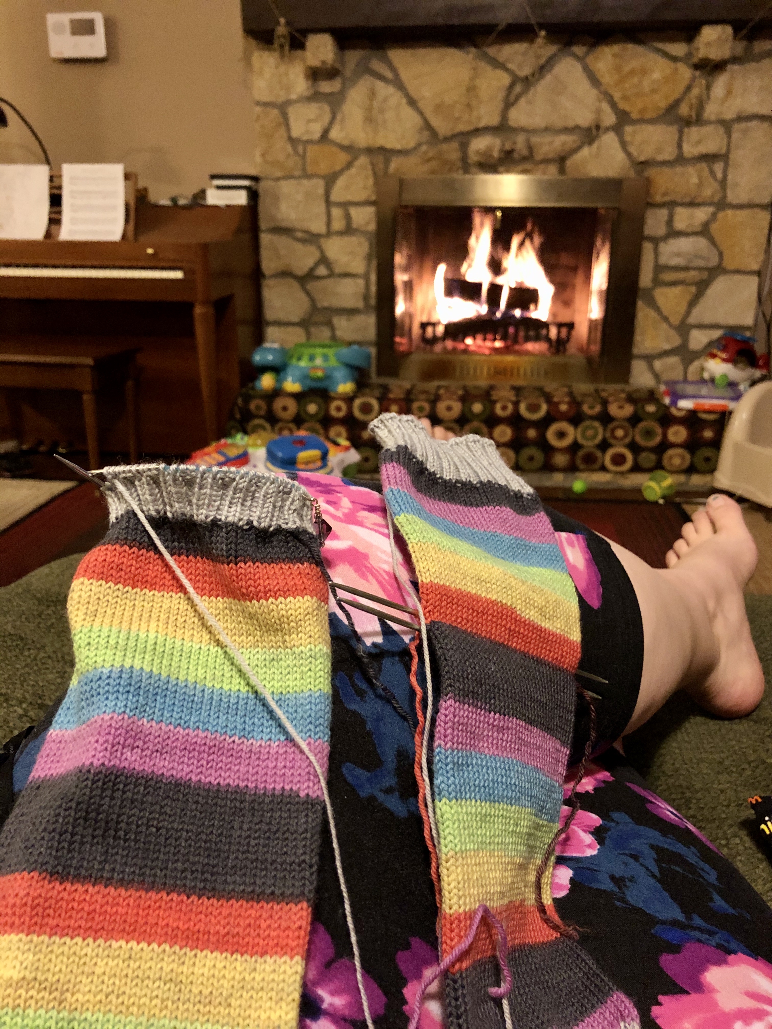I was trying to be a good knitter and give future Rachelle a leg up on finishing these socks. I decided to weave in the end on my Dark Side Vanilla Socks (Take Two) before starting the heels. I am making these from a sock machine cranked sock tube, so there are a LOT of ends to weave in from the contrast heels, toes and cuffs.