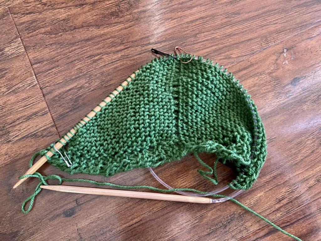 I am still in the first section that uses the main color. My main color is some oldl/deep stash of Cascade sock yarn in a green color. The pattern isn’t complicated but does require counting to make sure I create the correct number of increases. It just hasn’t “calling to me” from the WIP pile.