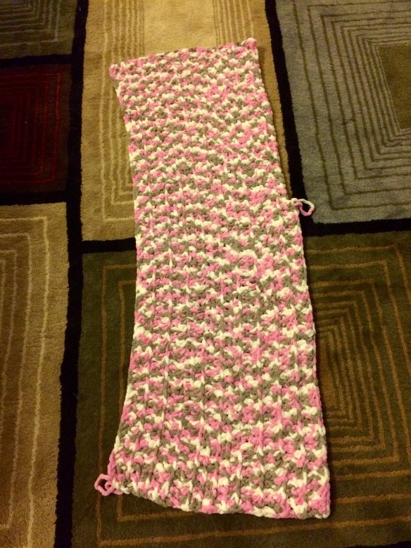 Well I got brave and I measured (twice to be sure) and then got out the scissors and snipped it apart in the center. I wanted to rip back a few rows on either side and re-knit a new border on each side. Thus creating two new appropriately sized blankets out of one large wonky one. Well I soon discovered that it was going to be impossible to pick up and re-knit the edges. The yarn was falling apart and I cold not discern the individual stitches in the midst of the chenille. Not to mention that the way I snipped was not the same direction as the way I needed to work. So on to another back up plan!