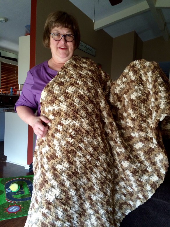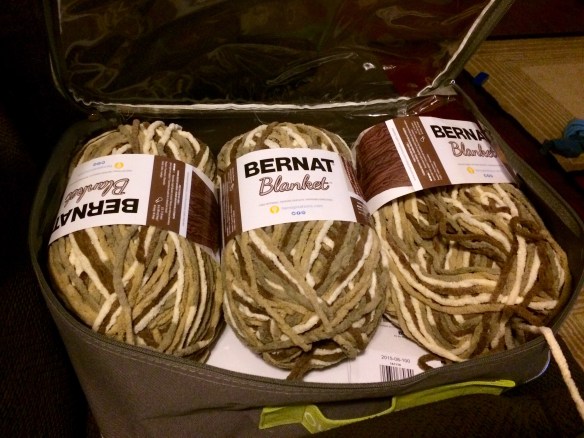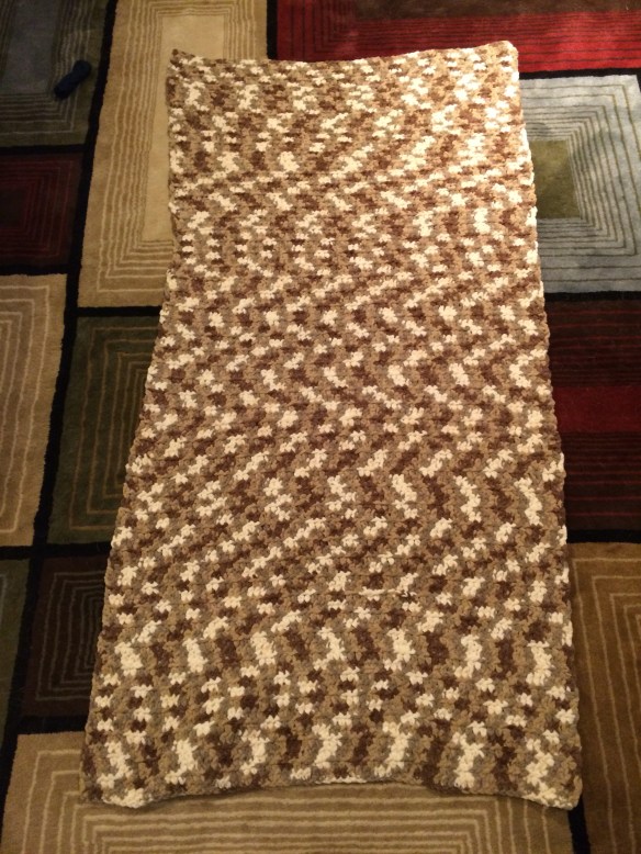 I grabbed some bulky weight yarn in really close color match and secured the loose stitches I had created with my cutting. I paired the two squares wrong side to wrong side and seamed around the outside with a whip stitch using the matching yarn. And you can see my results below. A double thick blanket/pad thingy.