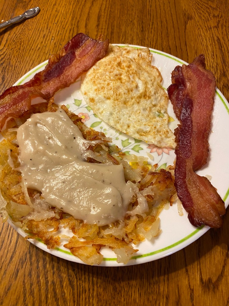 So Sunday morning, after the 4th of July, I found myself awake with PB with the rest of the house was snoozing. So PB and I raided the fridge to make breakfast. Being good hearty Midwestern folk I made a well rounded country breakfast. I turned leftover baked potato into hash browns, used up the last of the sausage gravy, cooked off some thick sliced bacon and fried a perfect medium egg in butter.