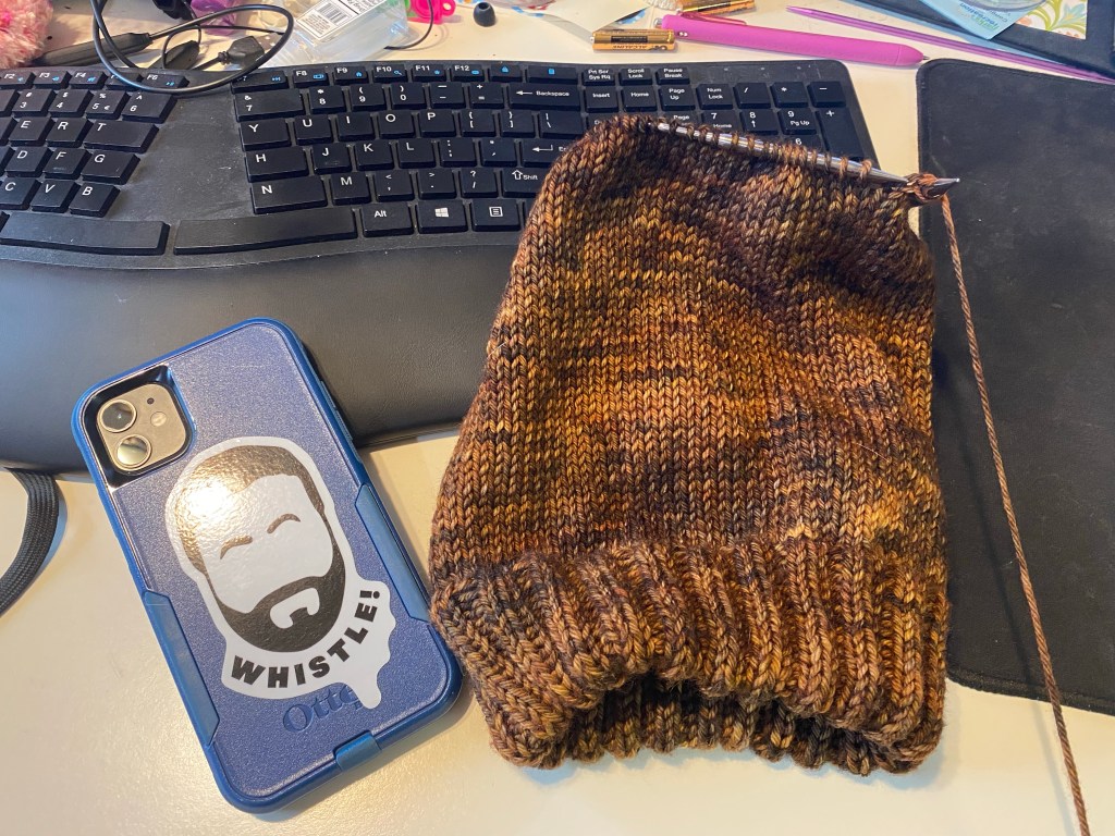Zoom definitely has its pros and cons, but it can be great for knitters. I had a few hours of training where I needed to focus and pay attention, so my Coworker Hat made a lot of progress!