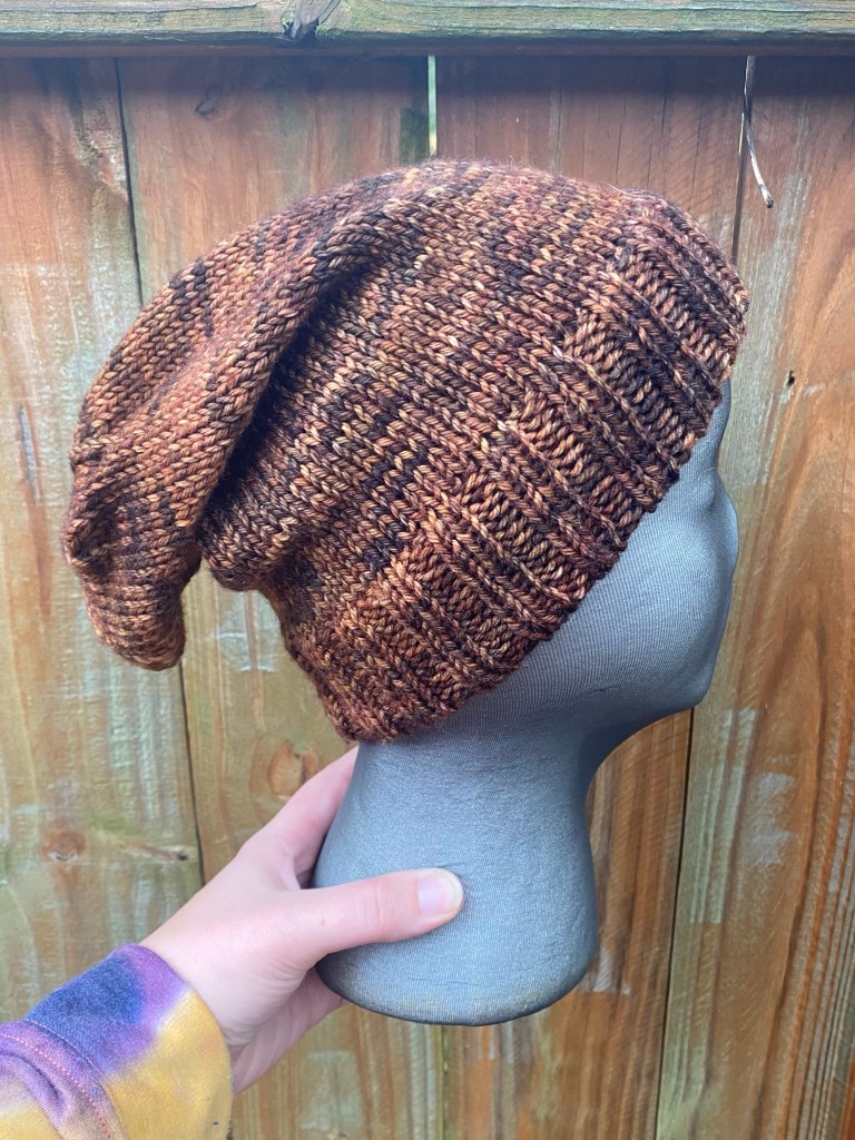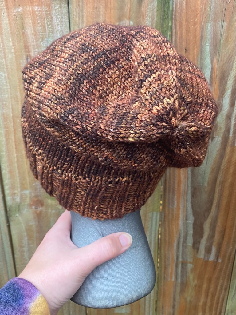 This is just about the perfect slouch for me in a hat. The decreases swirl nicely and fall at the correct part of my head. I am back to my “default” where I used 78 grams of worsted yarn for a 170 yard hat.