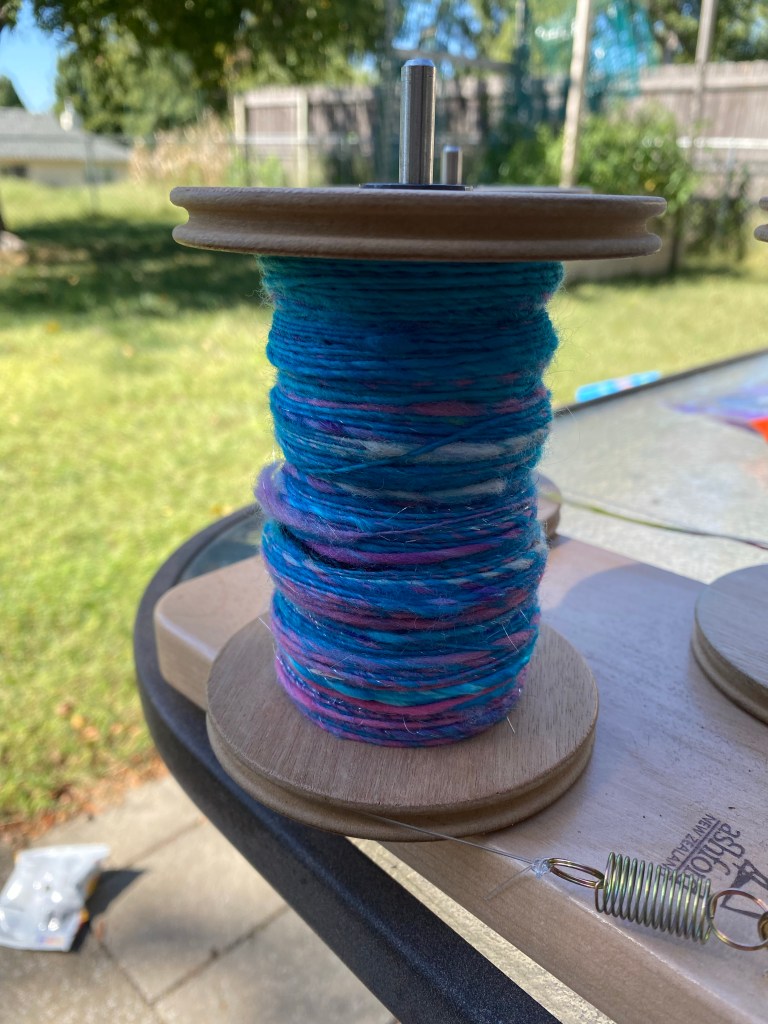 This calculated out to be an aran to bulky weight skein. I got 84 yards in a 78 gram skein. After plying and washing, the yarn is still twisting back on itself. Which means I overplied it. I can run this skein back through my wheel in the opposite direction to let some that relax. But for now, I’m done touching cotton candy and I need to spin something else.