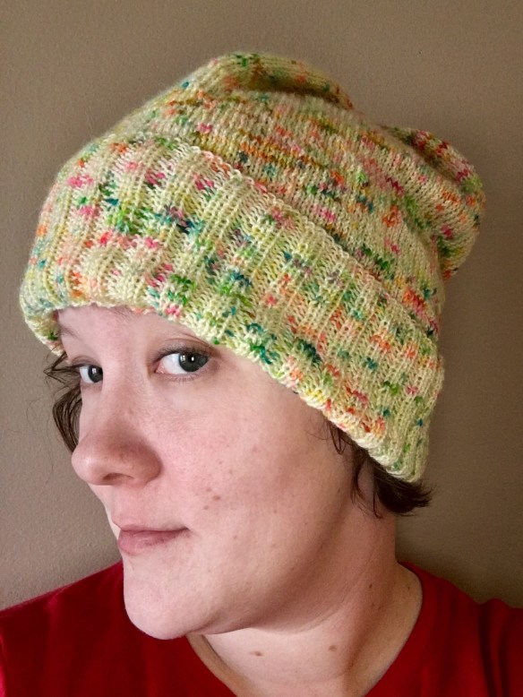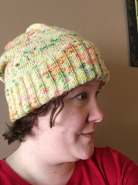 I used some Countess Ablaze Blueface Baron Fingering in the This Ain’t A Scene colorway. I won this jewel of a skein back here. I followed the Sockhead Slouch by Kelly McClure using 3 US needles. I didn’t check gauge and I’m not sure I measured completely accurately in each section. So my hat isn’t as slouchy as some I’ve seen. And I’m pretty sure that due to knitting the decreases while knitting in the wild made me have some unintentional design features, lol. But it’s finished and fits me nonetheless.