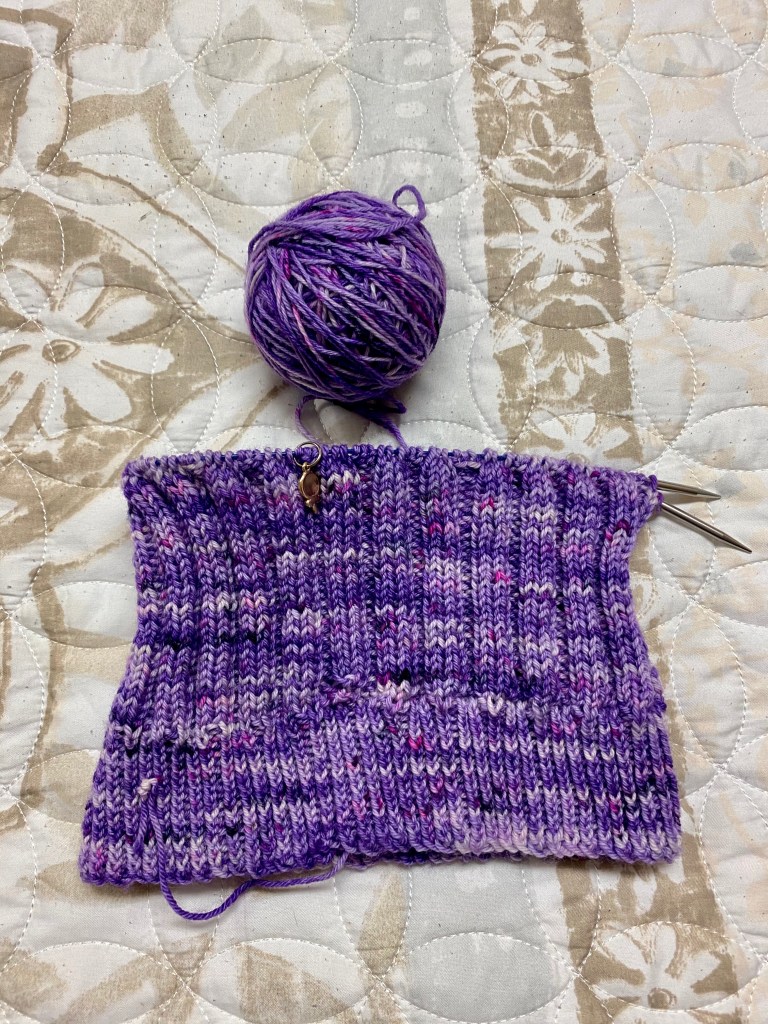 We will see how fast the I-cord mood hits me. I did have to open a second skein of this Chromatic Yarns DK yarn. I don’t think I will use hardly any of it but for sure I could not eek this project out of a single skein for my size.
