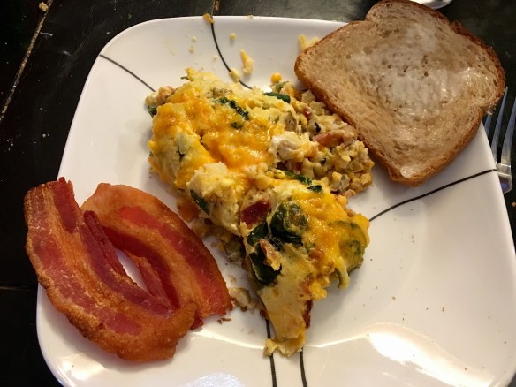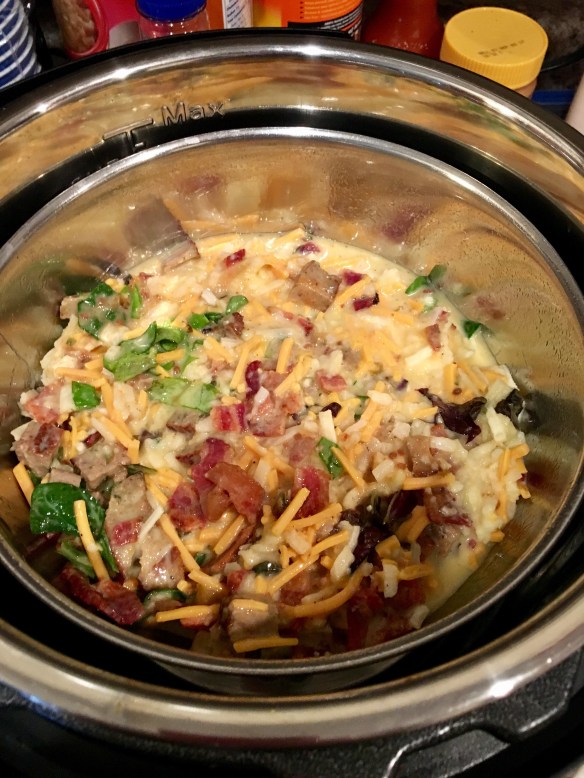 I decided to pull out a recipe from my new cookbook for the Instant Pot. I picked the breakfast casserole because I had all the ingredients and it sounded yummy. Basically it’s a steamed egg casserole with spinach, bacon, sausage, cheese, hash browns and seasonings. This is what it looked like before: