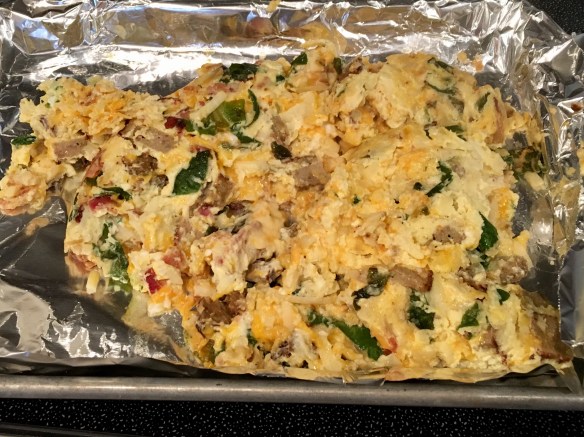 I dumped it onto a cookie sheet, added some extra cheese and broiled for several minutes to finish it off. Now it was extremely tasty and loved by toddler and adult alike. Just not very pretty….