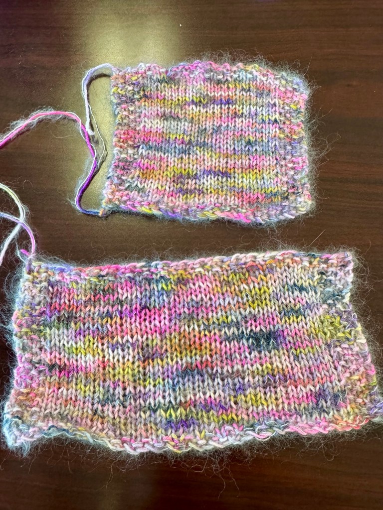 I knit the top swatch first with the pattern recommended gauge. And boy howdy….was she tight. I was easily 4+ stitches over gauge. So I went up from US 7s to US 9s. And a bath for both led to me to understand that US 9s are what I need. My row gauge is off a little but I can account for that.