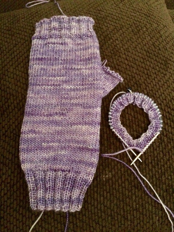 In a fit of knitting furvor….I failed to pay attention. I was just zooming along on mitt number two and only eyeballing it compared to mitt one. See the problem?