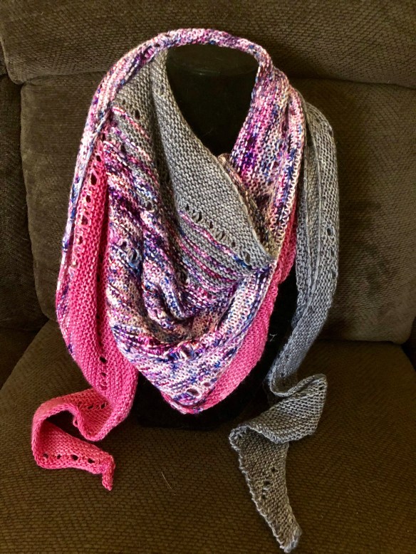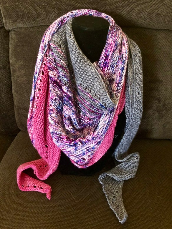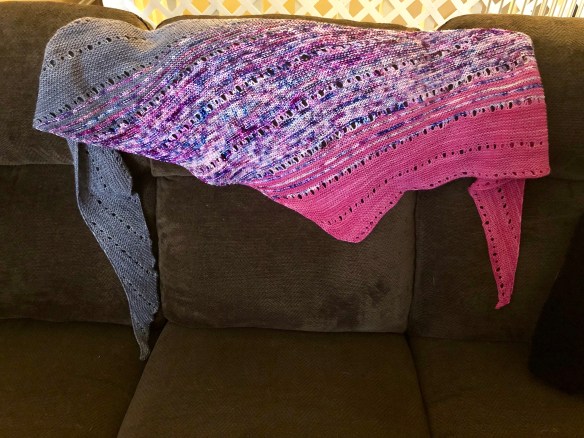 My fade isn’t super duper subtle as it would be with a more graduated set of colors. But I love it and pretty proud of myself for my first fade! I do wish my larger yarn overs were a little neater. But I was too far in when I noticed and I decided that consistent yarn overs made my brain happier than neat ones would.