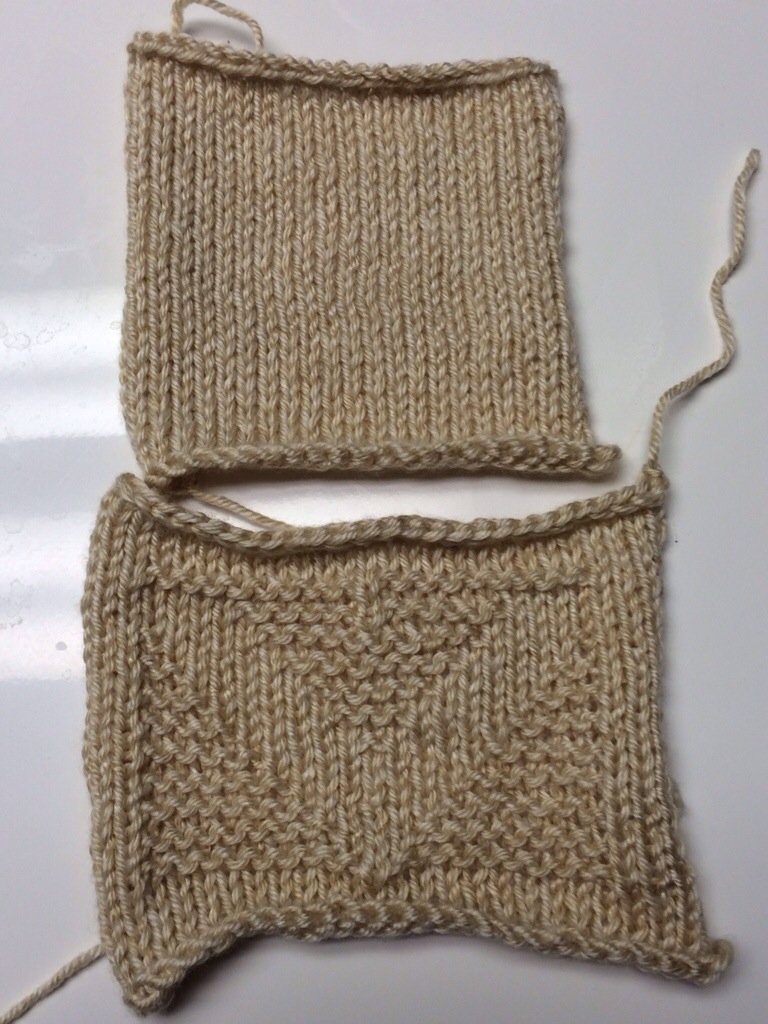 I started with the pattern called for US6s and knit a full sized swatch (bottom). I washed and dried it and carefully measured it and I had WAY to many stitches. Like 5 too man which would have made a way too small of a garment. So I then pulled out 7s and made another swatch, albeit a tid bit smaller than first, and dutifully washed and dried it. This time I got a lot closer to gauge but not exactly right on.