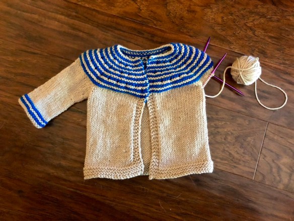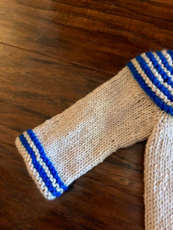I just grabbed the DPNs at the bottom of my project bag and merrily knit away. Well, they are one size smaller than the needles I used for the body. And boy howdy can you tell they are different gauges. I quickly made the executive decision that I don’t get enough knitting time to rip them out and redo them. I’m just going to call this an “unintentional design feature” and move on the second sleeve.