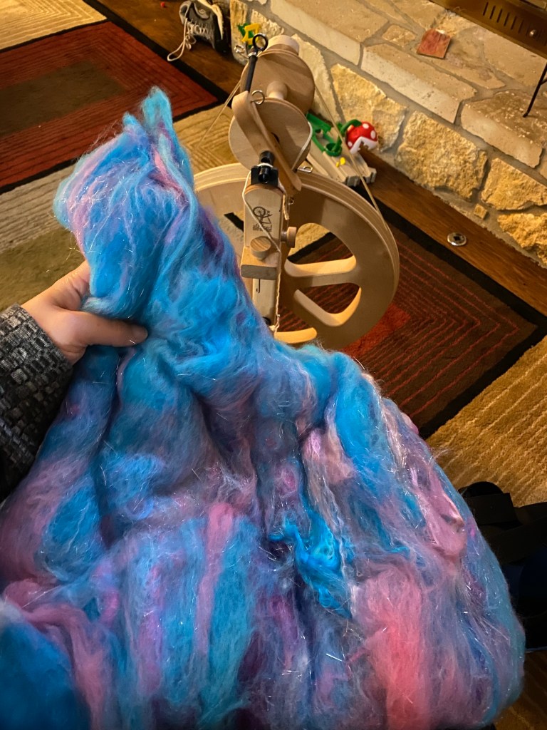 Next up on my wheel is some beyond bonkers cotton candy looking mixed fiber. I am calling this my Cotton Candy spinning because it looks like someone mashed together blue and pink cotton candy.